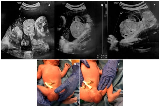 A case of fetal inguinoscrotal hernia (fetal sonographic findings at 38 + 6 weeks of gestation: (A,B) a 4.0 × 3.5 cm right scrotal mass, mainly solid, with regular wall, complex echotexture, no blood flow signal and (C) a few small echo-free cystic areas in its interior; (D,E) postnatal examination).