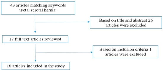 We conducted a close literature examination of scientific articles using the PubMed/MEDLINE medical database. The search terms used were “fetal scrotal hernia” from inception to 31 September 2023. Inclusion criteria were all human cases of fetal inguinoscrotal hernia with prenatal US assessment and confirmed by postnatal examination and surgery. Exclusion criteria included all animal cases of fetal inguinoscrotal hernia, cases with no full text available, cases without prenatal US assessment, cases without postnatal confirmation and cases of postnatal inguinoscrotal hernia. A total of 43 articles matched the keywords “fetal scrotal hernia”. The titles and abstracts of these articles were screened by the authors (R.M. and I.C.) to determine which articles could undergo full-text review. A total of 26 articles were excluded based on the title and abstract, and 1 article was also excluded because the full text was not available. A total of 16 papers were finally identified independently and met the inclusion criteria after full text evaluation (Figure 2).