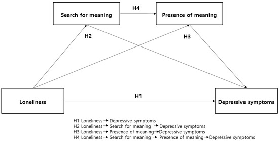This study examined the relationship between loneliness and depressive symptoms, whether this relationship can be mediated by meaning in life, and the differential role of the search for and presence of meaning in relation to depressive symptoms among older adults. Specifically, this study hypothesized that loneliness is related to greater depressive symptoms (H1); the two dimensions of meaning in life (search for and presence of meaning) mediate the relationship between loneliness and depressive symptoms (H2, H3); and the search for and presence of meaning have a serial mediating effect on the relationship between loneliness and depressive symptoms among older Korean adults (H4) (Figure 1).