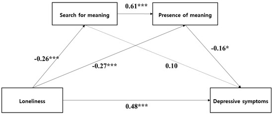 A bootstrap analysis was performed and the confidence intervals were estimated to examine the direct and indirect effects of H1, H2, H3, and H4. As shown in Table 3, the direct effect of loneliness on depressive symptoms was positively significant (β = 0.520, 95% CI = [0.413; 0.627]). The mediating effect of the presence of meaning on the relationship between loneliness and depressive symptoms was significant (β = 0.043, 95% CI = [0.003; 0.095]), but that of the search for meaning was not significant (β = −0.027, 95% CI = [−0.079; 0.008]. Moreover, the serial mediating effects of the search for meaning and presence of meaning between loneliness and depressive symptoms were significant (β = 0.025, 95% CI = [0.003; 0.063]. Based on the analyses, H1, H3, and H4 were supported, but H2 was not.