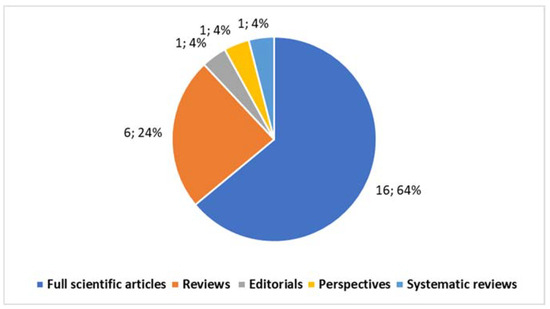 The Special Issue has successfully achieved a significant milestone, featuring 25 contributions (excluding this editorial) (Contribution 1–Contribution 25), attracting the attention of 26,701 authors at the time of writing. The published papers, according to the selected categories (Figure 1), encompass 1 introductory editorial (Contribution 1), 16 full scientific articles (Contribution 2–Contribution 17), 6 reviews (Contribution 18–Contribution 23), 1 perspective (Contribution 24), and 1 systematic review (Contribution 25).
