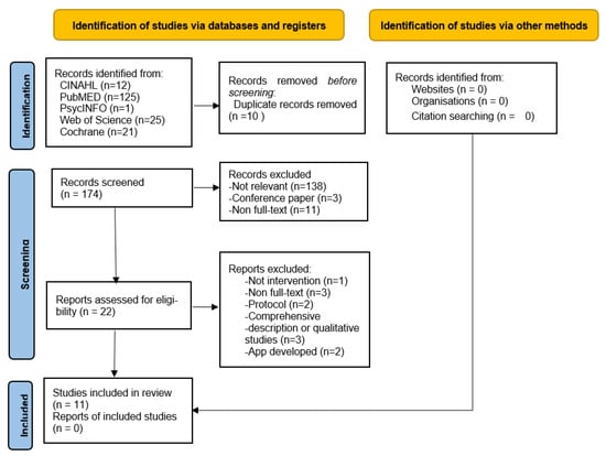 A total of 184 articles were extracted from the five databases. After removing duplicates (n = 10) as well as abstracts and articles that did not meet the inclusion criteria, 152 articles were excluded, leaving 22 articles for consideration. Two independent reviewers conducted the screening based on the inclusion and exclusion criteria and resolved any discrepancies through discussions. Based on the inclusion and exclusion criteria, 11 articles were subsequently excluded, resulting in a final set of 11 articles for the systematic review. The search results and study inclusion process are presented in the Preferred Reporting Items for Systematic Reviews and Meta-Analyses flowchart (Figure 1).