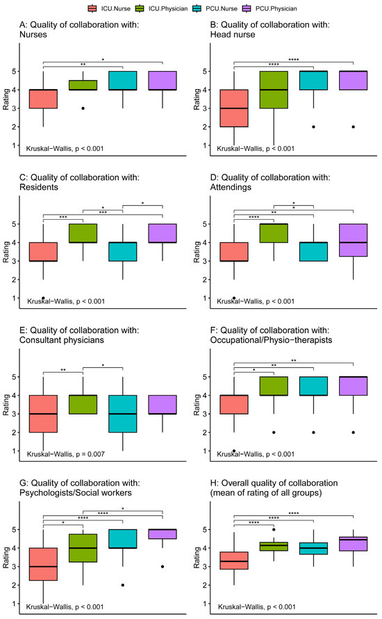 Comparison of perception of quality of interdisciplinary collaboration with different groups between intensive care and palliative care physicians and nurses. Tests for differences between groups were performed by the Kruskal–Wallis test. Comparisons between individual groups were performed using Wilcoxon rank sum tests adjusted for multiple comparisons by the Holm method (significance level: **** p ≤ 0.0001, *** p ≤ 0.001, ** p ≤ 0.01, * p ≤ 0.05, no parenthesis: not significant).