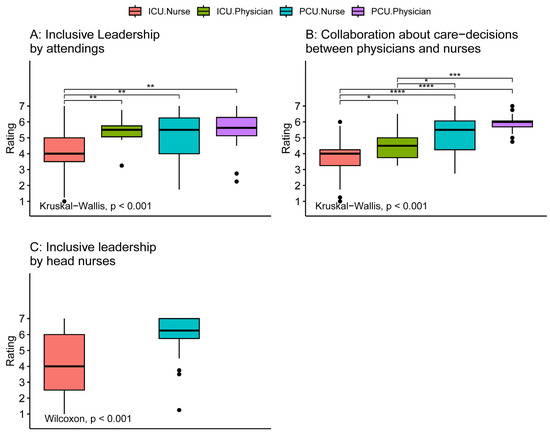 Comparison of perception of inclusive leadership and collaboration about care decisions between intensive care and palliative care physicians and nurses. Tests for differences between groups were performed using the Kruskal–Wallis test. Comparisons between individual groups were performed using Wilcoxon rank sum tests adjusted for multiple comparisons by the Holm method (significance level: **** p ≤ 0.0001, *** p ≤ 0.001, ** p ≤ 0.01, * p ≤ 0.05, no parenthesis: not significant). ICU: intensive care unit, PCU: palliative care unit.