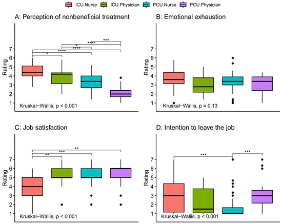 Comparison of perception of non-beneficial care, emotional exhaustion, job satisfaction, and intention to quit between intensive care and palliative care physicians and nurses. Tests for differences between groups were conducted using the Kruskal–Wallis test. Comparisons between individual groups were performed with the Wilcoxon rank sum tests adjusted for multiple comparisons by the Holm method (significance level: **** p ≤ 0.0001, *** p ≤ 0.001, ** p ≤ 0.01, * p ≤ 0.05, no parenthesis: not significant). Post hoc analysis of intention to leave the job revealed that among PCU physicians only residents showed an increased rating (Figure S1). ICU: intensive care unit, PCU: palliative care unit.
