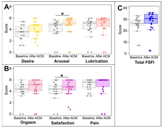 Female Sexual Satisfaction Index scores. Domains (A,B) and total score (C). * p < 0.05; values from Wilcoxon Signed Rank test; ACM, autologous cellular micrograft procedure.