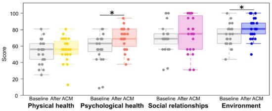 WHOQOL-BREF scores. * p < 0.05 from two-tailed t test; ACM, autologous cellular micrograft procedure.