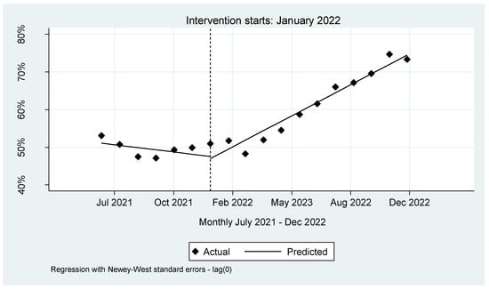 The analysis revealed a downward viral load coverage trend of 0.0002% per month. Notably, in the inaugural month of the intervention, a decrease of 0.0055% in viral load coverage occurred. However, this decline was transient, as it was succeeded by a statistically significant surge of 0.001% (p < 0.001, CI [0.0006–0.0014]). Further bolstering this finding is the lincom estimate, derived by specifying the post trend. This estimate showed that following the introduction of the integrated sample referral system, viral load coverage demonstrated a consistent average monthly increase at a rate of 0.0008% (p < 0.001, CI = [0.0006–0.0010]), see Figure 2 and Appendix A.