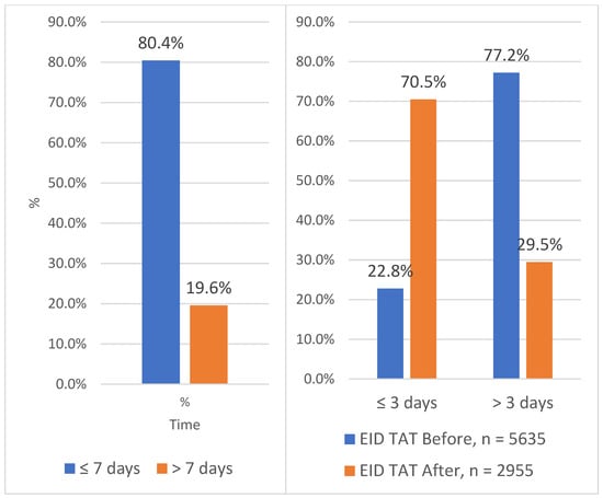 Before the introduction of the referral system, the results showed that both tests (VL and EID) were equally prioritized in terms of reducing the overall TAT, and this also correlated with the DBS sample used for EID and the plasma sample for VL testing. In 2017, the Ministry of Health supported the deployment of point-of-care (POC) EID/VL and the use of diagnostic network optimization (DNO) to improve facility testing and demand creation []. This assisted in reducing the demand for sample couriers in centralized testing. Due to the COVID-19 pandemic, which brought in competing demands and stress on the health system, most campaign programs had to realign to support the pandemic efforts, leaving VL and EID services struggling. After the introduction of the integrated referral system, priority was given to EID samples leading to an almost 50% increment in EID TAT within 3 days. This was within both the local and national acceptable EID TAT of within 3 days and 7 days, respectively. Prioritizing EID is a major step towards achieving the prevention of mother-to-child transmission during the breastfeeding stage and ultimately helps with HIV epidemic control by reducing the number of new infections.