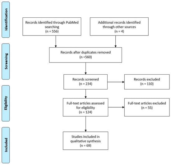 The initial PubMed search yielded 556 references and, additionally, four records from other sources. Of these 560 documents, 234 were screened for eligibility, while 124 full texts were assessed. Eventually, 69 were found relevant and included in the present analysis, with only three reporting empirical research from Greece. The study flowchart is presented in Figure 1.