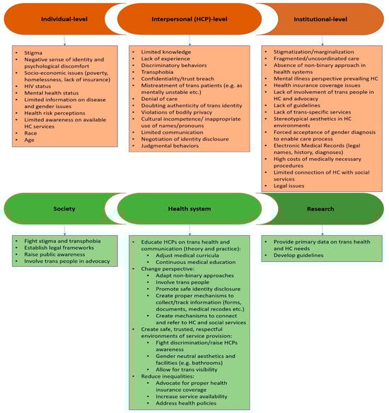 Apart from the limited access to general healthcare services, the lack of services specifically for transgender individuals and their particular health needs (e.g., mental, sexual, reproductive, endocrinological, etc. health issues experienced specifically by transgender people) was noted in many studies as a substantial barrier to care for transgender individuals [29,35,39,50,51,60,64,81,83,84,85]. In the same context, many stretched the need for accounting for inclusive healthcare environments where transgender professionals are involved in care planning and decision making and where trans identity is visible and the general ambient aesthetic refrains from the stereotypical binary expression.