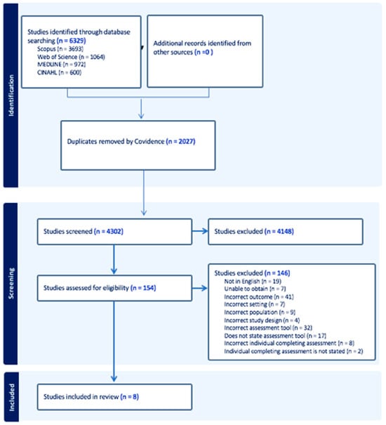 The initial search yielded 6329 studies, prior to 2027 duplicates being removed. The titles and abstracts of the remaining 4302 studies were screened, and 154 studies were eligible for full text review. A further 146 studies were excluded, resulting in eight papers describing seven studies eligible for inclusion, as shown in Figure 1. The primary reasons for exclusion were the incorrect outcome being reported and the incorrect assessment method used to obtain diagnosis.