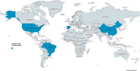Four studies were cross-sectional [59,60,61,62,63] and three studies were cohort [64,65,66]. The oldest study was published in 1996 [64] and the most recent study in 2018 [59,62,63]. The studies were geographically distributed across four continents and five countries, with two studies conducted in South America (Brazil [59,62,63]), two studies conducted in North America (USA [64,65]), two studies conducted in Europe (The Netherlands [60] and Spain [66]), and one study conducted in Asia (China [61]). Figure 2 provides an overview of the geographic distribution of the included studies [67].