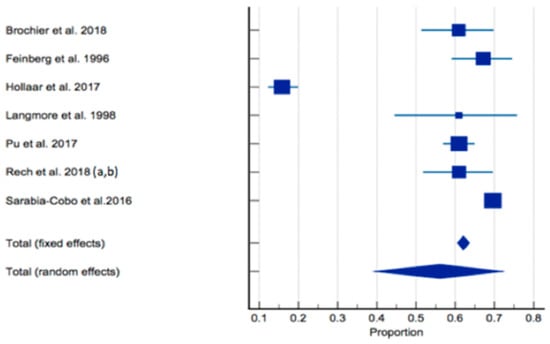 The prevalence of dysphagia ranged from 16% [60] to 69.6% [66]. In total, seven studies of 3772 residents were included in the meta-analysis [59,60,61,62,63,64,65,66]. The pooled prevalence of dysphagia in individuals living in RACFs was 56.11% (95% CI 39.363–72.172, p < 0.0001, I2 = 98.61%) (Figure 3). Sensitivity analysis was conducted with the study by Hollaar et al. (2017) [60] due to reporting a significantly lower prevalence of dysphagia. Removing this study from the meta-analysis had an appreciable effect on the pooled prevalence of dysphagia, increasing the prevalence to 64%, and a significant reduction in heterogeneity (95% CI 59.194–68.827, p = 0.0007, I2 = 76.43%) (Figure 4). Based on the results of the Egger’s test, there was no publication bias for the included studies regarding the prevalence of dysphagia (p = 0.4198).