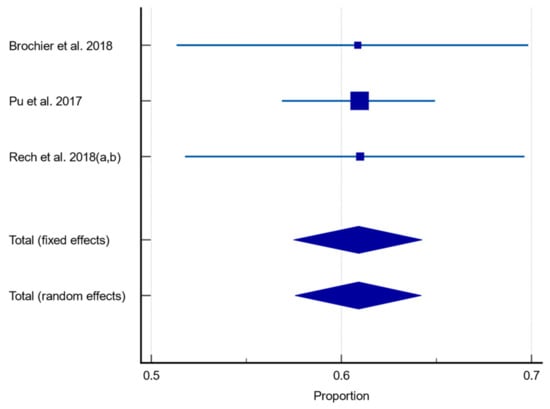 Forest plot of prevalence of dysphagia assessed using CSE only using random effects model [59,61,62,63]. Q = 0.001121, DF 2, p = 0.9994, I2 = 0%, 95% CI for I2 = 0–0. Publication bias—Egger’s test, intercept = −0.04661, 95% CI = −0.3681–0.2789, p = 0.3301.