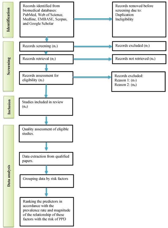 We will exclude grey literature, protocol papers, editorial letters, reviews, and case studies from the current review. Articles describing mental problems, neurocognitive diseases, and mood disorders prior to the delivery will not be considered. Also, the project will not cover COVID-19-related factors of postpartum mental health in women.