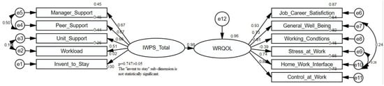 AMOS diagram of the relationship between individual workload and quality of work life.