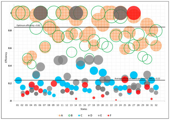 In terms of the efficiency of individual DMUs, which represent institutions at the state level, the results demonstrate two relevant points. First, the efficiency of DMUs within the same institution varied across states. Second, efficiency varied across different states in Mexico. These results underscore that the technical efficiency of an institution can significantly vary across different regions of the country, and these variations may be associated with the size and type of the population served. Thus, there are instances where institutions possess unused service capacity, while large segments of the population paradoxically lack access to those unused public resources. This situation reflects the lack of coordination between population needs and available resources.