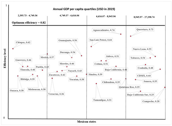 The analysis of the relationship between the technical efficiency of the state-level health system and the state GDP per capita revealed no correlation between efficiency and the socioeconomic conditions of the state. Notably, distinct efficiency scores coexisted independently of GDP quartile (Figure 3). In the lower quartile (lowest GDP), efficiency ranged from 0.379 to 0.618, mirroring a similar range observed in the upper quartile (0.245–0.726). Particularly noteworthy in the upper quartile is Campeche, which has the highest GDP per capita (USD 27,298.74) and the second lowest efficiency level in the nation (0.280). Likewise, Spearman’s correlation analysis showed no statistically significant association between technical efficiency and the state GDP per capita.