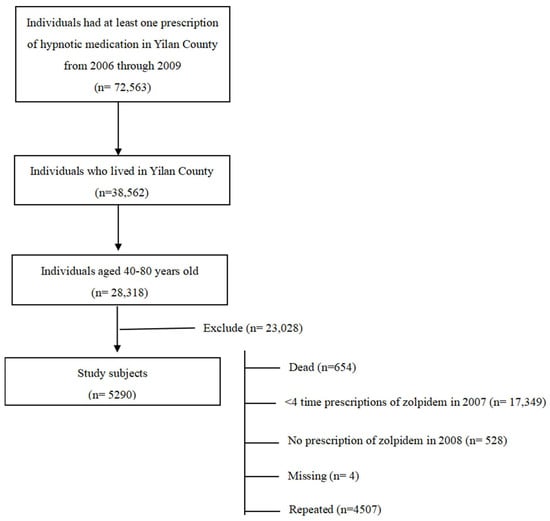 From 2006 through 2009, a total of 72,563 individuals in Yilan County had at least one prescription for a sedative–hypnotic medication. Among them, 38,562 individuals who lived in Yilan County were identified using a method that combined their insurance classification, the locations of their hospital visits, and their insurance registration. Then, 28,318 of them were found to be aged 40–80 years old. After further excluding those who were deceased (n = 654), those who had fewer than four prescriptions of zolpidem in 2007 (n = 17,349), those who had no prescription of zolpidem in 2008 (n = 9528), missing cases (n = 4), and repeated cases (n = 4507), the final study cohort included 5290 study subjects who received at least one prescription of zolpidem in 2008 (Figure 1).