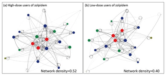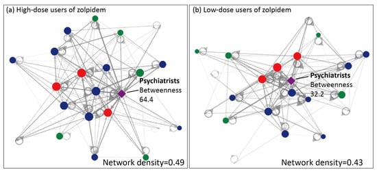 Our findings from the network measurements also confirmed the important role of psychiatrists in the network of zolpidem prescriptions. This is understandable given that having mood disorders was shown to be the single disease entity which had the highest risk of a sufferer being a high-dose user of zolpidem (adjusted OR = 3.93, 95% CI 3.27–4.73) in this study. In fact, insomnia may be the most common symptom in individuals with mental disorders. For instance, at least 80% of patients with a major depressive disorder have been shown to present insomnia-related symptoms []. Prior studies have also revealed that insomnia is strongly linked (odds ratios = 4.0–6.0) to poor mental and physical health, psychological distress, anxiety, depression symptoms, and somatic symptoms [,,,]. The social network analyses revealed that, based on our betweenness centrality analyses involving psychiatrists and healthcare institutions of any level, higher betweenness centrality values were observed in low-dose users (betweenness centrality = 64.4) compared to high-dose users (betweenness centrality = 32.2). This suggested that psychiatrists may have a stronger influence on the network of low-dose users of zolpidem than on the network of high-dose users. Therefore, psychiatrists may have a central role in the medication-seeking behavior of low-dose zolpidem users; however, for high-dose zolpidem users, the influencing role of psychiatrists is weakened. For patients using high doses of zolpidem, their medication-seeking behaviors seemed to be mainly driven by patient-related factors. In the future, efforts should be directed towards government-regulated dispensing systems for sedative–hypnotic drugs to prevent repetitive refills of sedative hypnotics; additionally, widespread public health education and specialized training for healthcare professionals across various specialties on prescribing sedative–hypnotic drugs, especially in terms of their knowledge related to drug addiction, are urgently needed. There is also a need to further strengthen the role of psychiatrists within the healthcare network to address and improve the issue of sedative–hypnotic drug abuse.