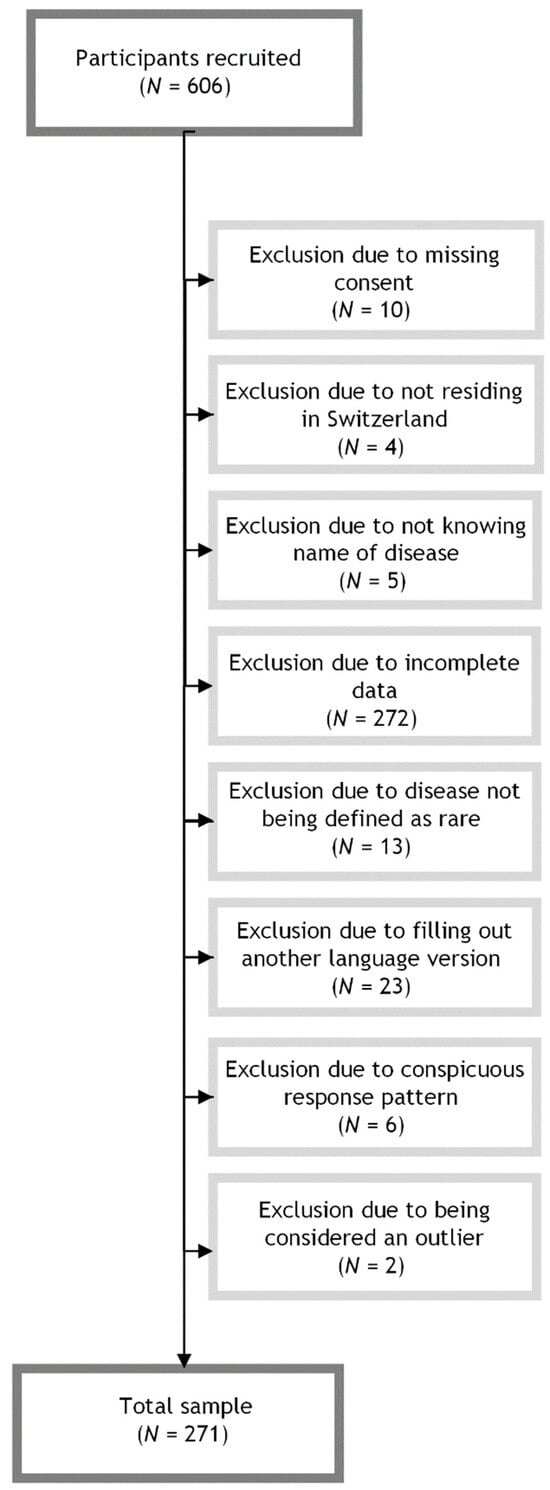 To be included in the study, participants needed to be at least 18 years old; residing in Switzerland; have sufficient knowledge of German, French, Italian, or English; have a medically confirmed RD diagnosis; and be able to name their respective RD. We defined RD as a disorder affecting fewer than 1 in 2000 people in the European population as delineated in the European Parliament and Council Regulation on Orphan Medicinal Products [22]. A total of 32 participants were excluded from the analysis for disease not meeting RD criteria (N = 13), not providing consent (N = 10), not knowing the name of their disease (N = 5), and not residing in Switzerland (N = 4). To ensure criterion-related validity, one skill for each dimension of access was selected for analysis based on the Levesque framework [14]. We excluded participants who did not complete the scales measuring healthcare access skills and those with incomplete PAHQ data (N = 272). As the present study specifically focused on the German version of the PAHQ, participants who filled out the English, French, or Italian versions of the study were excluded (N = 23). A uniform response pattern was considered an indicator of low-quality survey data and may affect the reliability and validity of the results [23]. Accordingly, surveys that showed signs of careless responses (i.e., answering all PAHQ items identically) were excluded (N = 6). Individuals were excluded from the analysis if they were identified as outliers (i.e., falling outside the whiskers of the boxplot). Specifically, data points that fell below the lower whisker (values below Q1 − 1.5 × IQR) or above the upper whisker (values above Q3 + 1.5 × IQR) were considered outliers [24]. Subjects were similarly considered outliers if responses were identified as outliers on at least 25% of PAHQ items. Outliers were removed from the dataset to minimize the potential impact of extreme values on the analysis (N = 2). The dataset used for analysis included a total of 271 participants. A flowchart illustrating the exclusion process is provided in Figure 1.