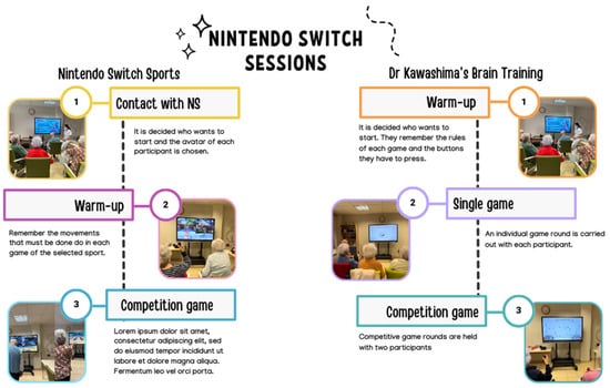 After being assigned to the intervention groups, all participants then attended occupational therapy sessions. Participants in the control group (CG) received conventional occupational therapy sessions two days a week for the maintenance of their cognitive and physical abilities, each lasting 60 min. Conventional occupational therapy included sessions of cognitive stimulation, psychomotor skills, reflective reading therapy, and upper limb functional activities, among others. The duration of the treatment was 8 weeks. Participants assigned to the experimental group (EG) received conventional occupational therapy sessions two days a week with a duration of 60 min (same as the CG), in addition to two sessions per week with the Nintendo Switch, lasting 50 min each. None of the EG members had previously used the Nintendo Switch.