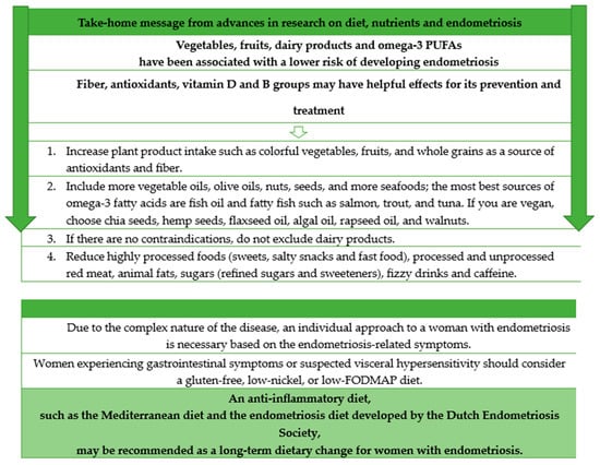- Fjerbæk, A.; Knudsen, U.B. Endometriosis, Dysmenorrhea and Diet—What Is the Evidence? Eur. J. Obstet. Gynecol. Reprod. Biol. 2007, 132, 140–147. [Google Scholar] [CrossRef] [PubMed]