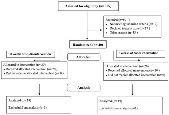 The participants included 40 sedentary, non-physically active, healthy women that were recruited through advertisements on social media. Participant age range was 20–45 years, the average age = 30.45 ± 5.8 years; and average body mass index [BMI] = 22.8 ± 5.8. Most participants were single (80%), had no children (85%), and held full-time employment (87%). Two inclusion criteria were implemented in this study: (1) women who had not participated in physical activity on a regular basis over the past six months; and (2) women who did not take medication on a regular basis (excluding birth control pills). Four exclusion criteria were also implemented in this studying, including (1) women who were pregnant; (2) women who reported having a chronic disease or injury; (3) women who planned to change their diet or physical activity routine during the study intervention period; and (4) women who were not approved by the physician during the evaluation session to take part in this study.