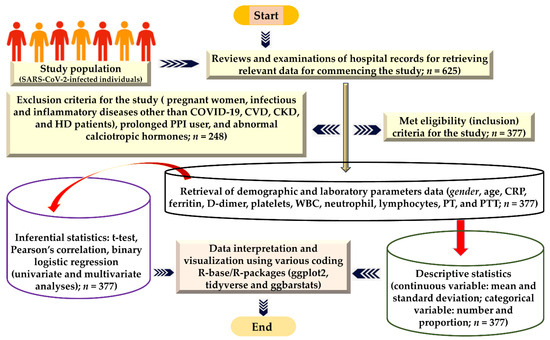 Exposure assessment was executed by collecting throat swabs aseptically from individuals suspected to be infected for SARS-CoV-2 exposure examination and re-examination at a specific specimen collection center for COVID-19-suspected individuals at Qunfudhah Hospital. Complying with the manufacturer’s instructions, specimens were processed and analyzed by employing real-time reverse transcription polymerase chain reaction (RT-PCR). The viral-genomic RNA analysis was accomplished using an open reading frame 1b/nucleocapsid (ORF1b/N) gene PCR kit (KOGENEBIOTECH, Seoul, Republic of Korea) and previously reported standard operating procedures [37]. For assessing the hematological parameters of the COVID-19-positive individuals, patients’ fasting whole blood specimens were collected in tubes (EDTA-treated) and analyzed within 30 min of the collection time. Beckman Coulter DxH 900 was employed to determine the complete blood count (CBC). Viros System Integrated XT 7600 equipment was used to assess the laboratory parameter C-reactive protein (CRP). Ferritin level was determined by a DxI 800 analyzer (Beckman Coulter, Brea, CA, USA). The Stago automated device measured a light-blue tube (3.2% sodium citrate) containing D-dimer. The diagnosis and categorization of COVID-19 were according to the Saudi National Health Council’s COVID-19 recommendations and treatment (MOH 2020). Data obtained (demographic, laboratory parameter) and included in this study were reviewed multiple times, and a rigorous collection procedure was ensured to avoid collection errors. The severity status of COVID-19 disease (moderately severe and highly severe) was obtained from the hospital record based on the need for a ventilator, CT score, and ICU admission for highly severe patients, while the rest of the admitted patients with normal oxygen saturation were admitted to the COVID ward for moderately severe disease. Data were added to the MS Office/excel sheet for stratification and further processing. Incomplete/missing data were identified and removed manually to avoid discrepancies. A comprehensive self-explanatory illustration of the method adopted for carrying out this study is demonstrated in Figure 1.
