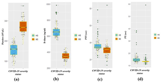 A significant (p < 0.05) variation in the mean ± SD CRP (mean ± SD: highly severe (HS), 102.4 ± 22.9; moderately severe (MS), 21.3 ± 6.9; p-value < 0.001), D-dimer (mean ± SD: highly severe (HS), 661.1 ± 80.6; moderately severe (MS), 348.7 ± 42.9; p-value < 0.001), and ferritin (mean ± SD: highly severe (HS), 875.8 ± 126.8; moderately severe (MS), 593.4 ± 67.3; p-value < 0.001) of the HS and MS groups of the participants were observed (Table 2). The COVID-19-infected HS group exhibited significantly soaring concentrations of c-reactive protein (CRP), D-dimer, and ferritin compared to the MS category. Nevertheless, a significant (p < 0.05) drop in the concentration of platelets was observed in the HS category compared to the MS category (mean ± SD: HS, 154.0 ± 31.8; MS, 274.2 ± 34.9; p < 0.001), which is tabulated in Table 2. Moreover, the results also demonstrated a significantly (p < 0.05) increased prothrombin time (mean ± SD: HS, 15.3 ± 3.9; MS, 13.5 ± 3.6; p-value < 0.001) and partial prothrombin time (mean ± SD: HS, 15.3 ± 3.9; MS, 13.5 ± 3.6; p < 0.001) in the HS group in comparison to the MS category (Table 2). Furthermore, the other laboratory markers/parameters such as WBC, neutrophils, and lymphocytes in COVID-19 HS participants were also significantly high. The median (IQR) of neutrophil, WBC, ferritin, and CRP biomarkers by severity status is represented in Figure 2a–d respectively. Whereas the median (IQR) of platelets, D-dimer, PTT, and PT markers by COVID-19 severity status is illustrated in Figure 3a–d respectively.