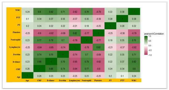 A comprehensive correlation matrix (correlogram) explaining the strength and polarity of the correlations between laboratory parameters in COVID-19-infected participants was deduced (Figure 4). The matrix demonstrated the positive correlations of CRP with neutrophil (correlation coefficient/cr = 0.77), ferritin (cr = 0.74), and WBC (cr = 0.8); nevertheless, the high-strength negative correlation of lymphocyte with ferritin (cr = 0.74) and CRP (cr = 0.84) was observed (Figure 4). Additionally, the matrix represented the correlation between vital coagulation-disorder laboratory parameters. D-dimer correlated with platelets (cr = −0.82), PT (cr = 0.22), and PTT (cr = 0.37), which is illustrated in Figure 4.