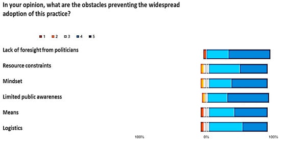 Within the Likert scale associated with the set of options for ‘‘In your opinion, what are the obstacles preventing the widespread adoption of this practice?”, the most favored choice was “lack of foresight from politicians”, garnering the highest average rating of 4.4 (STD ± 0.42).