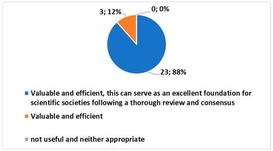 An intriguing aspect emerges in the responses to a question offering three distinct choices, “I think that the proposed tool is:”. The graphical representation (Figure 9) highlights a unanimous positive sentiment toward the ES, with every option reflecting a favorable opinion. Notably, the most favored choice, selected by 88% of respondents, expressed that the survey was “Valuable and efficient, serving as an excellent foundation for scientific societies”. This overwhelming preference holds substantial significance, as demonstrated by the χ2 test (p < 0.01), underlining a robust consensus among participants regarding the commendable nature of the ES.