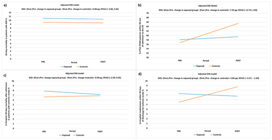 DID-adjusted model for the evaluation of pre-/post-intervention (PP) changes in: (a) 30-day mortality after first hospital admission of AMI patients; (b) proportion of PTCA performed in STEMI patients within 90 min of admission to the ER; (c) in-hospital mortality within 30 days of first hospital admission in patients with ischemic stroke; (d) proportion of hospital readmissions within 30 days of discharge for ischemic stroke in exposed patients and controls.