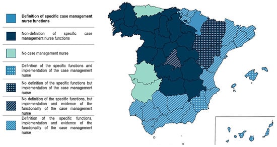 There is evidence that eight autonomous regions (47%) have implemented case management. As is known, the Autonomous Community of the Canary Islands was a pioneer in promoting CM in Spain, although it did not standardize the figure of the NCM until 2002, the year in which a second autonomous community implemented this figure [22,40,48].