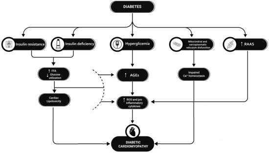 Etiopathogenesis of diabetic cardiomyopathy. T1D and T2D cause diabetic cardiomyopathy by several mechanisms: Insulin deficiency and insulin resistance lead to a reduction in glucose for myocardial trophism and an accumulation of FFAs, which instead become the predominant energy source at the cardiac level, leading to progressive lipotoxicity; hyperglycemia leads to an accumulation of AGEs at the myocardial level, which in turn leads to a local increase in ROS and proinflammatory cytokines. At the same time, mitochondrial and sarcoplasmic reticulum dysfunction leads to altered calcium homeostasis in myocardial cells, which leads to increased local inflammation; finally, in diabetes, the inappropriate activation of the RAAS system is an additional mechanism leading to increased proinflammatory cytokines release. The interaction of these factors results in progressive fibrotic transformation of myocardial tissue and heart failure. T1D = type 1 diabetes; T2D = type 2 diabetes; RAAS = renin–angiotensin–aldosterone system; FFA = free fatty acid; AGEs = advanced products of glicosilation; ROS = reactive species of oxygen.