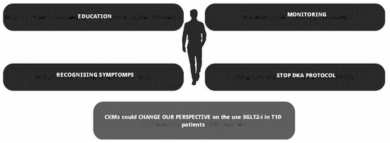 DKA is one of the most dangerous complications of diabetes, characterized by the triad of hyperglycemia (plasma glucose > 250 mg/dL), metabolic acidosis (arterial pH < 7.3 and serum bicarbonate < 18 mEq), and ketosis [74]. Balanced meals are crucial for individuals with T1D to manage blood sugar levels and prevent DKA [75]. An adequate intake of carbohydrates, proteins, and fats is necessary to avoid the breakdown of fats for energy, which can lead to the buildup of ketones and risk of DKA [75]. DKA requires immediate medical intervention because of its dangerousness. Euglycemic ketoacidosis [76], which characterizes patients with T1D being treated with SGLT2is, poses a serious challenge for the clinician, as patients may present with glucose levels in the normal range, leading to a potential delay in the appropriate management of the DKA [74]; this risk persists when SGLT2-is are combined with GLP1-agonists [77,78,79,80]. SGLT2-is increase the risk of DKA through several pathways (see Figure 2): (1) if the patient’s insulin dose is insufficient to match carbohydrate intake, creating an environment for metabolic ketogenesis, SGLT2-Is may promote further ketogenesis and increase the risk of developing DKA; (2) SGLT2-Is may cause an increase in renal sodium reabsorption which can interfere with the clearance of ketone bodies; (3) SGLT2-is may reduce plasma volume and dehydration as a result of the increased urinary glucose excretion; and (4) SGLT2-is increase glucagon levels, both through the direct action of SGLT2-i receptors on the pancreatic alpha cells that regulate preproglucagon synthesis [81] and also through an increased urinary glucose loss leading to compensatory glucagon production [82]. Similarly, continuous subcutaneous insulin pumps (CSIIs) have been shown to increase the risk of DKA due to the risk of insulin non-delivery caused by mechanical problems [83,84]; with CSIIs, the problem of the increased risk of DKA has been largely overcome over the years by the introduction of continuous blood glucose monitoring (CGM) systems equipped with hyperglycemia alarms, in addition to progressive improvements in patient education [1]. In SGLT2-i treatment, several measures can be taken to reduce the risk of DKA, as shown in Figure 3. Furthermore, in these patients, education in the management of T1D becomes even more important due to the risk of euglycemic DKA, which prevents us from relying exclusively and solely on data from CGMs since, in this case, measured glucose levels alone are not sufficient to prevent DKA [85]. To this end, new devices capable of measuring different biomarkers, such as ketone body levels, may be useful in the future to prevent DKA [86]. A useful tool for ketosis management, which is still unproven by RCTs, could in the future be the “STOP DKA Protocol”, which consists of a set of indications for patients for the early recognition and management of ketosis [87]. In this protocol, subjects are instructed to monitor the symptoms of ketosis and are provided with a card that directs them to different prescriptions according to the degree of capillary ketonemia [87]. This protocol extends the previous “STITCH protocol” [88] and the 2019 “International Consensus on Risk Management of Diabetic Ketoacidosis in Patients with Type 1 Diabetes Treated With Sodium–Glucose Cotransporter (SGLT) Inhibitors” [85] by emphasizing the indications for the management of ketosis even in the presence of euglycemia. A combination of strategies may help prevent DKA in patients with T1D treated with SGLT2-is as follows: education to balance carbohydrate and insulin intake; specialized training to monitor ketone levels regularly, and especially in the presence of symptoms that may indicate the presence of ketosis; and the ability to apply the “STOP DKA PROTOCOL” and adjust therapy as appropriate, which is also very important. In the future, sensors capable of continuously monitoring ketone body levels may be helpful, especially if they are equipped with alarms capable of alerting the patient to rising ketone body levels. Although these protocols offer a plausible modality for the management of ketosis in T1D treated with SGLT2-is, it must be remembered that their use has not been validated by RCTs and are currently insufficient to clear the use of these drugs in this population considering the risk of euglycemic DKA.