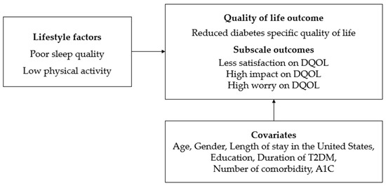 Figure 1. Conceptual framework illustrating the relationships of sleep quality and physical activity with Diabetes Quality of Life (DQOL) among Korean Americans with Type 2 diabetes mellitus (T2DM).