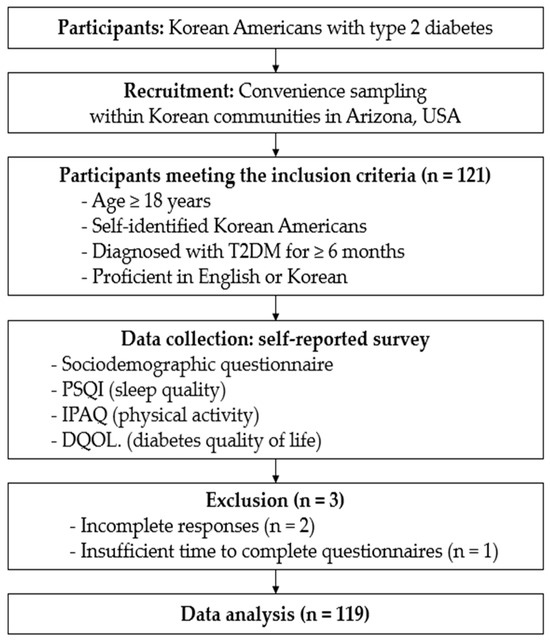 The study, conducted from July to November 2016, involved face-to-face interviews with 121 Korean American adults with T2DM from Arizona, of which 119 completed the necessary questionnaires and measurements. Three participants were excluded due to the following reasons: two participants provided incomplete responses, and one participant had insufficient time to complete the questionnaires. Participants used the Korean versions of the questionnaires. Before data collection, they were informed about the study, its purpose, procedures, benefits, and risks, and provided written informed consent. The survey included self-reported questionnaires on background information, the Pittsburgh Sleep Quality Index (PSQI), the International Physical Activity Questionnaire (IPAQ), and the Diabetes Quality of Life (DQOL) in Korean. After completion, questionnaires were reviewed, and incomplete items were filled in if the participant agreed. The study followed standard ethical procedures for human subject research, ensuring informed consent and data accuracy, and was approved by the Institutional Review Board of the university.