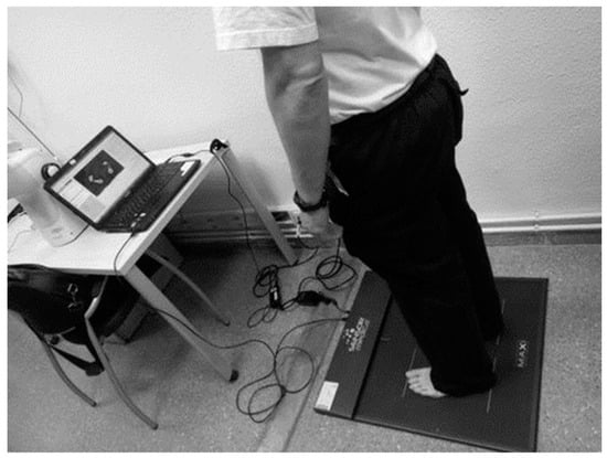 Plantar pressure: Foot pressure distribution was measured with a Freemed baropodometric pressure platform (SensorMedica, Rome, Italy), composed of a pressure-sensitive plate with an active surface of 400 mm × 400 mm and 8 mm thick. The platform weighs 4 kg and contains resistive sensors, gold-coated 24k with conductive rubber. The number of sensors per square meter is 10.000, and the platform supports a maximum pressure of 150 N/cm2. Acquisition frequency 400 Hz. FreeStep v.1.0.3 software (Rome, Italy) was used to record and analyze the data. The reliability of this baropodometric platform has been shown in other studies [39]. The subject was asked to stay for 10 s as still as possible in a barefoot standing position, with feet approximately at pelvis width, looking straight ahead and keeping their arms at their sides in a comfortable position (anatomically neutral posture). The measurement was performed twice for each participant (Figure 1). For each baropodometry register, the surface (cm2) and mean pressure (kPa) of each foot were analyzed. Moreover, to analyze the pressure by region, the foot was divided into forefoot and rearfoot regions, taking the mean pressure (kPa) in each region. Forefoot and rearfoot variables correspond to the plantar pressure sum (kPa) of the right and left feet. Left and right mean pressure correspond to the plantar pressure of each separate foot. Total foot pressure corresponds to the sum of the right and left feet. Total foot pressure corresponds to the sum of the right and left feet. The total foot surface corresponds to the sum of the right and left feet. The mean pressure was established from the 10-s recording. For defining the fore and rear foot areas, the software divides the footprint, considering 40% of the surface for the forefoot and the remaining 60% of the surface for the rearfoot. The division percentages are made on the length of the foot.
