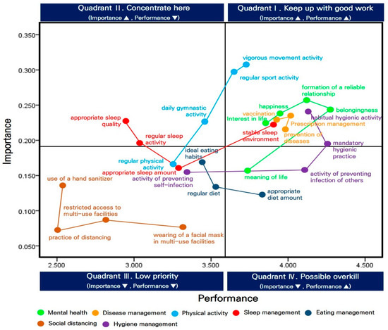 | Quadrant I | Importance ↑ Performance ↑ | happiness, interest in life, belongingness, formation of a reliable relationship, prevention of diseases, prescription management, vaccination, regular sports activity, vigorous movement activity, stable sleep environment, habitual hygienic activity, mandatory hygienic practice |