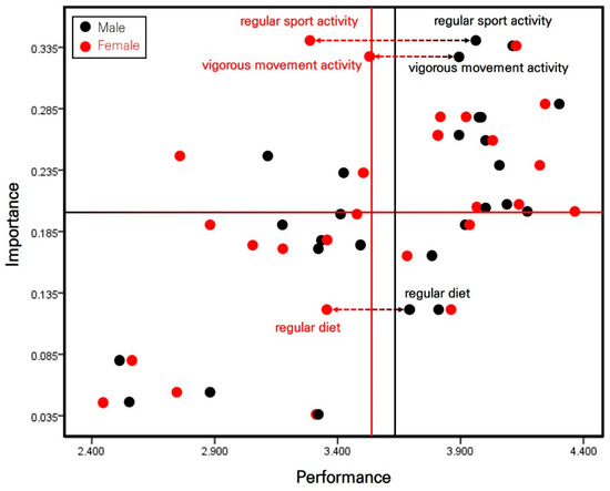 | Quadrant II | Importance ↑ Performance ↓ | Male | daily gymnastic activity, appropriate sleep quality |