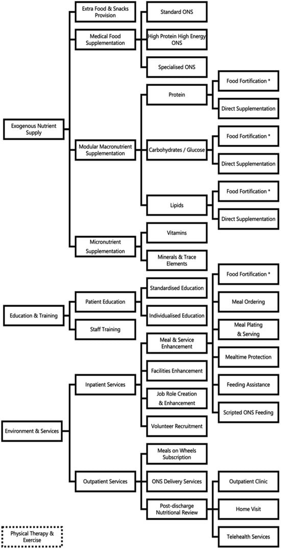 In clinical practice and research, nutrition intervention may involve a single-component strategy such as direct provision of nutrients via the use of medical and non-medical food. More frequently, interventions involve multiple strategies, such as targeting various aspects of biochemical and biologic pathways (e.g., anti-inflammatory, appetite, and muscle stimulation) [4,5,6,7,8], nutritional knowledge (e.g., dietary counseling of patients and caregivers, and improving nutritional knowledge of healthcare professionals) [9,10,11], and service provision/quality (modifying the hospital environment, food services, and optimizing nursing and post-discharge care) [12,13,14,15,16,17,18,19].