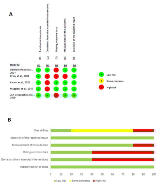 Two independent authors (M.P. and R.D.) evaluated the quality of the selected studies using Cochrane risk of bias tool, the RoB 2 tool [55]. The tool comprises of the following domains: randomization process, deviations from the intended interventions, missing outcome data, measurement of the outcome and selection of the reported result. According to the Cochrane Collaboration Risk of Bias Assessment Tool, a study is judged to be at low risk of bias if it is of low risk for all domains and is judged to raise some concerns if at least one domain raises some concerns, but not to be at high risk of bias for any domain. Finally, a study is considered of high risk if it is judged to be at high risk of bias in at least one domain.