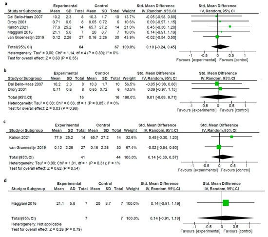 (a) Forest plot of the effect of all types of interventions on pain in ALS patients. (b) Forest plot of the effect of exercise on pain in ALS patients. (c) Forest plot of the effect of combined on pain in ALS patients. (d) Forest plot of the effect of OMT on pain in ALS patients [32,36,37,58,59].