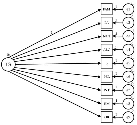 Lifestyle (LS) acts as an exogenous variable and is inferred by nine indicators: FAM (family and friends), PA (physical activity), NUT (nutrition), ALC (alcohol and drugs), S (sleep and stress), PER (personality), INT (introspection), HM (health monitoring) and OC (other behaviors).