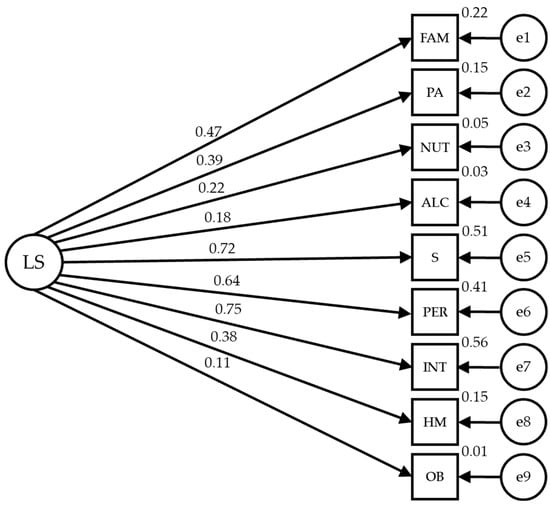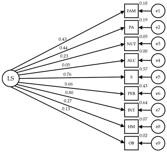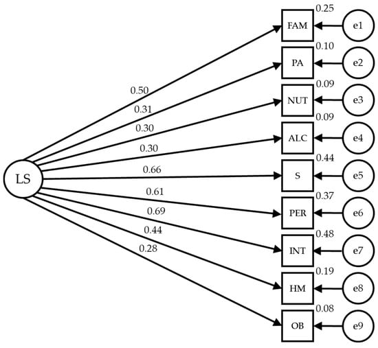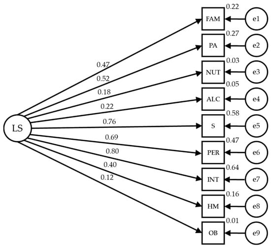 The proposed structural equation model for the lifestyle reveals a good fit in all the evaluation indices. The Chi-square shows a significant value of p (χ2 = 114.596; DF = 27; p < 0.001). However, standard interpretation cannot be applied to this index, in addition to the problem posed by its sensitivity to sample size. Thus, other standardized adjustment indices that are less sensitive to sample size are used. The comparative fit index (CFI) achieved a value of 0.934, which is excellent. The normalized fit index (NFI) achieved a value of 0.916 and the incremental fit index (IFI) was 0.934, both of which are excellent. The root mean square error of approximation (RMSEA) obtained an acceptable value of 0.061.