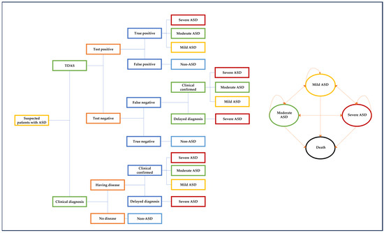 A two-phase model was applied: a diagnostic phase and a follow-up phase (Figure 1). During the diagnostic phase, a decision tree model was employed. Either TDAS or ClinDx was used to diagnose suspected patients. Patients with TDAS could be identified as test-positive and test-negative, with TDAS-positive patients further distinguished as true positives and false positives. True positive patients were categorized by ASD severity as mild, moderate, or severe, whereas false positive patients were considered non-ASD patients. Conversely, patients diagnosed with ClinDx were classified as ASD (having the disease) and non-ASD. ASD patients were further classified into clinically confirmed or delayed diagnosis. Patients with clinically confirmed ASD could be classified as mild, moderate, or severe, while patients with delayed diagnosis were assumed to have severe ASD. The severity of ASD was defined according to DSM-5 criteria: level 1 (requiring minimal support) for mild ASD, level 2 (requiring some support) for moderate ASD, and level 3 (requiring most support for daily living) for severe ASD. The delayed diagnosis was defined as a new ASD diagnosis after the age of five.