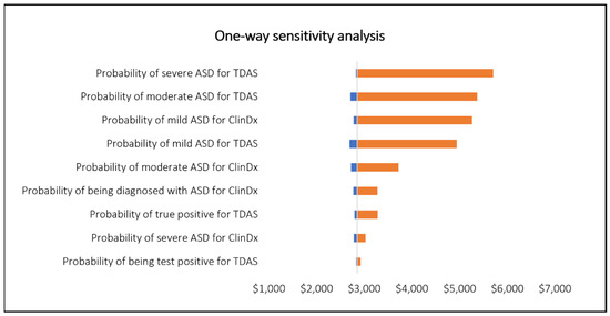 The one-way sensitivity analysis showed that the probabilities of severe and moderate ASD diagnoses using TDA, as well as the probabilities of mild ASD diagnoses using both TDAS and ClinDx, were the top four influencing factors of the findings. This suggests that variations in these inputs significantly affect the ICERs.
